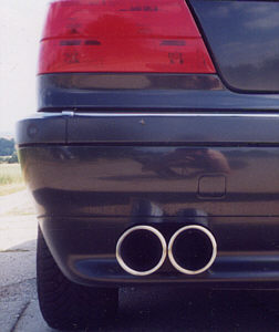 Das Anschweißen der Endrohre erfolgt nun durch die bereits vorhandenen Aussparungen.Dies aber ebend nicht parallel zur Straße (seitlich) sondern in den Himmel zeigend.Durch die hohen Aussparungen bleibt ja auch nichts anderes übrig.Nun umschließt die gesamte Heckschürze den Endrohrbereich mit etwa 5mm Luft rundum.