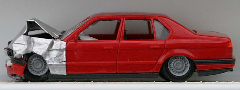 Na, mittlerweile habe ich den Wagen fertig gebaut - die Aluminiumfolie ist nun in Wagenfarbe lackiert. Jetzt sieht er richtig aus wie ein kalt verformter E32.