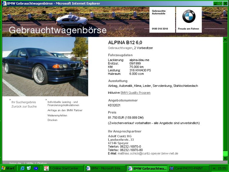 mit Corel Photo Paint (müsste eigentlich auch mit Paint funktionieren). Falls es nicht geht, auf BMW.de und dann weiter zu den Gebrauchtwagen. Dort Alpina auswählen und die Wahl beschränken auf B12. Dann seht ihr meinen neuen Zweitwagen.