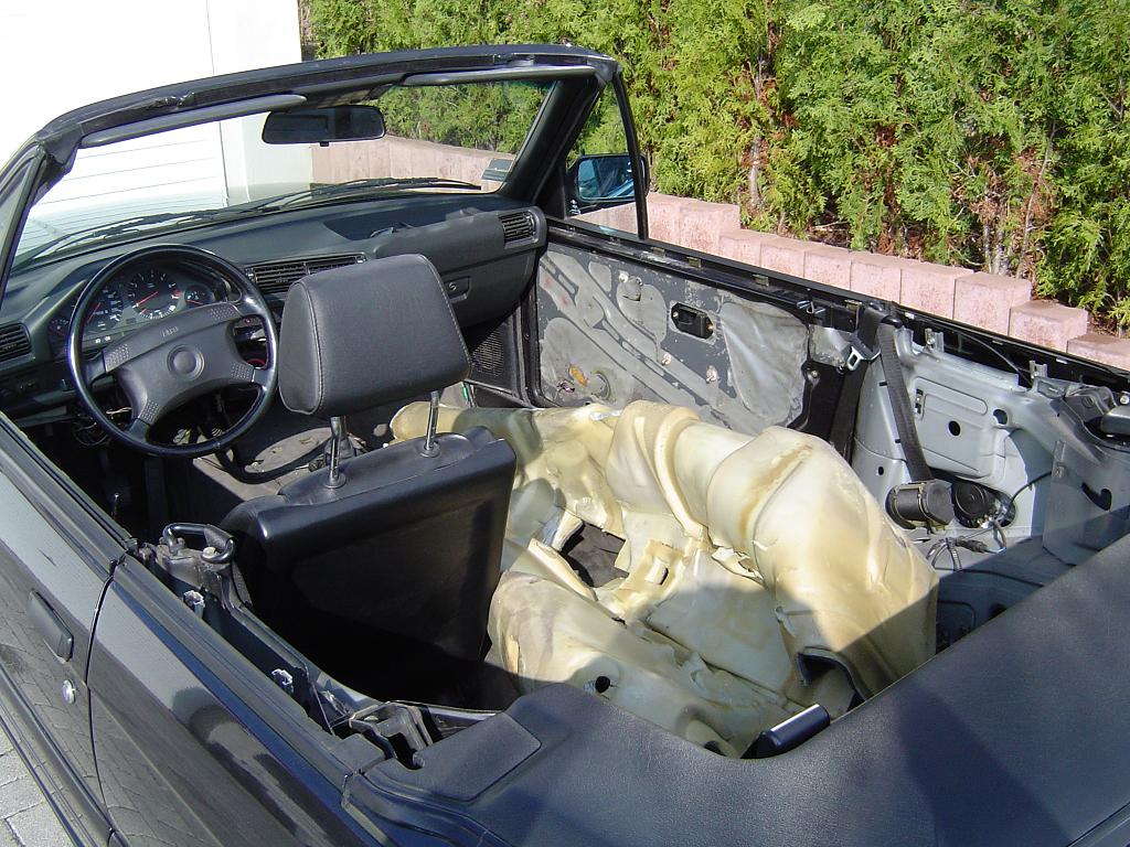 Das Cabrio ist ja komplett lackiert worden und an den Schwellern musste Rost enfernt werden. Deshalb hab ich den Innenraum gestrippt. Ich wollte sicher gehn, dass sich nicht doch noch irgendwo Rost findet, z. B. unter der Fahrerfußstütze gammeln die e30 sehr gern. Und der Teppich ist dort durchgewetzt, deshalb kommt ein neuer rein. Ansonsten wird alles wieder original zusammen gebaut.