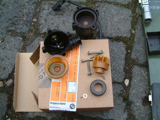 Mein km-Stand beim Tausch war 83000. Die Pumpe schnurrte ganz munter vor sich hin, ich habe nur auf Verdacht getauscht. Die alte Pumpe habe ich dann zerlegt, geht ganz einfach. War natürlich kaputt. Die Pumpe besteht einmal aus einem Motor mit Magneten und zum anderen aus einem Aufsatz mit Magneten und Flügelrad. Das Flügelrad ist aus dem gleichen hellen Plastik wie diese mistige Wapu des M50 die schon so einige Motoren auf dem Gewissen hat. Das Flügelrad war bei mir längs gerissen und hatte sich vom Magneten gelöst. Somit lief zwar der Motor der Pumpe aber das Flügelrad stand. Es ist also eine Alterungserscheinung.