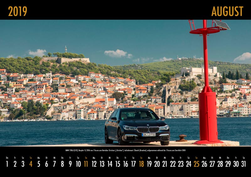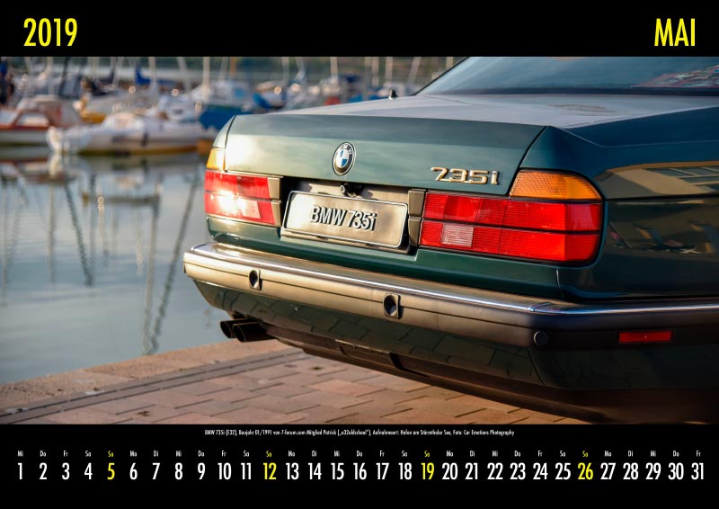- jede BMW 7er-Modellreihe (inkl. der neuen Baureihe G11/G12) soll im Kalender vertreten sein