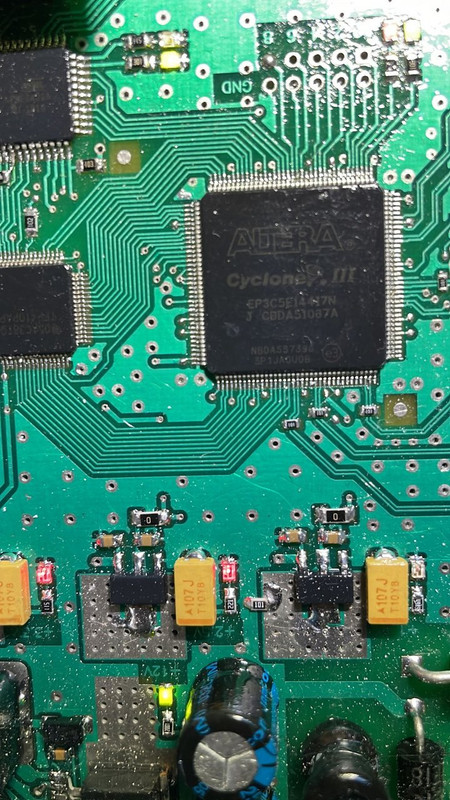 Hier ist das Kabel vom Stecker aufgelötet und geht dann von da mit dem 2. Kabel zu einer weiteren Platine , Funktion keine Ahnung.