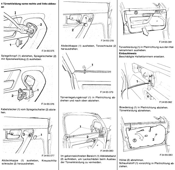 Du mußt erst die Holzleisten abnehmen (geklipst), damit Du an die Schrauben des Türhebels (eine links, eine rechts von selbigem) drankommst. Schrauben rausdrehen, clipse rundherum lösen (an den Außenkanten der Türverkleidung mit sanfter Gewalt ziehen).