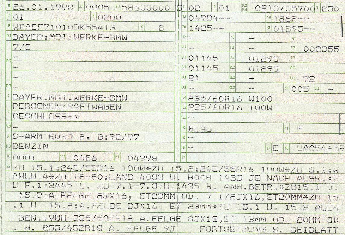 Hab dir mal die Zulassung von meinem 740i-Schlachter online gestellt, sind die neuen Papiere, keine Ahnung, welche Ziffern du brauchst.