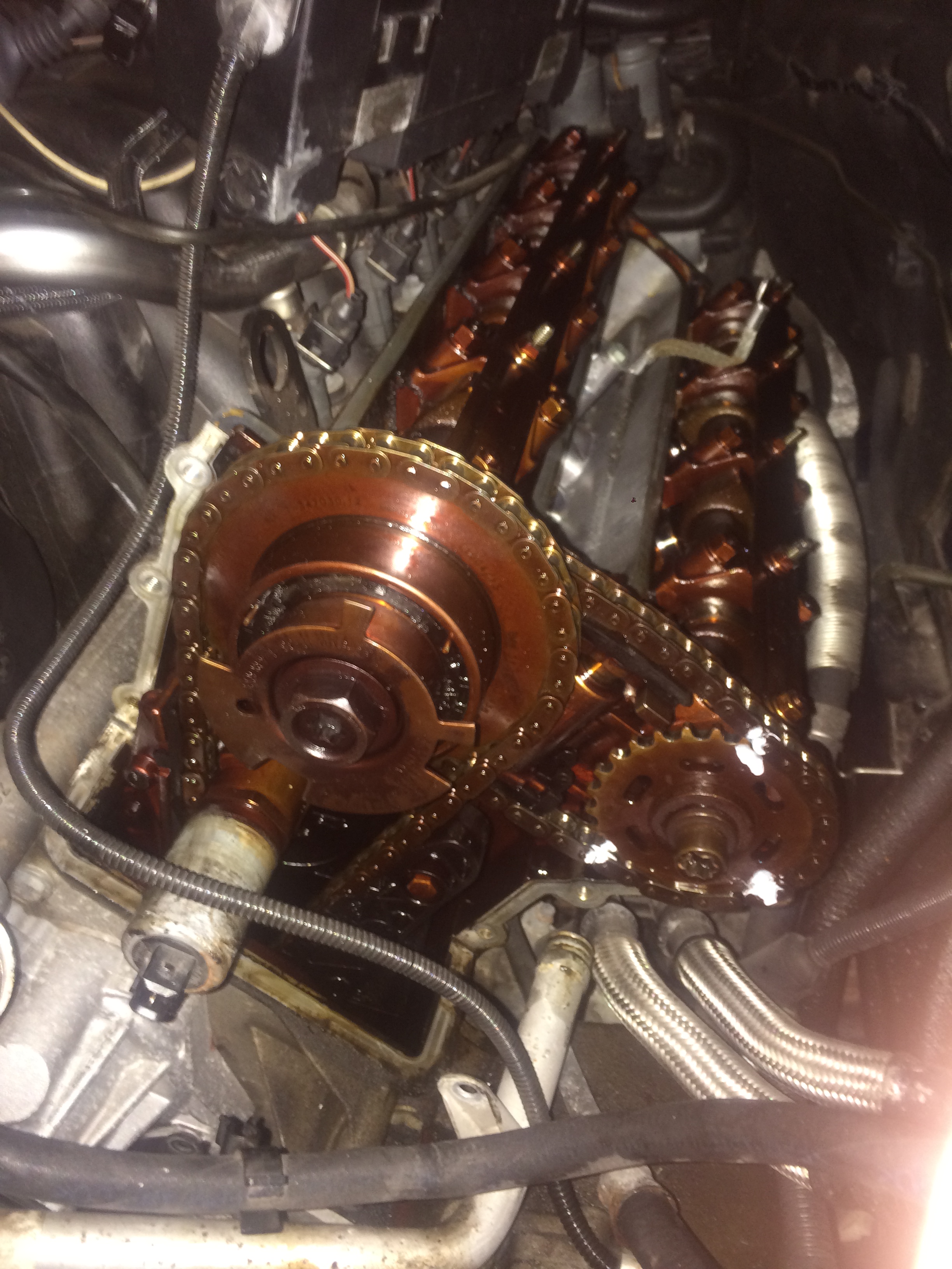 , zu gehen und entschied mich die Nockenwelle selbst (nicht die der VANOS) zu lösen in der Hoffnung dadurch soviel Spiel zu bekommen, den Kettenspanner aus seinem Sitz zu lösen und auszubauen, und siehe da, entgegen aller Vorhersagen hat das funktioniert und ich konnte ihn an der Kette vorbei rausfädeln, wenn auch nur in einem sehr kleinen Bereich.