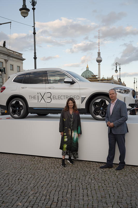 Staatsoper für alle 2020:  Iris Berben (Schauspielerin), Sebastian Mackensen (BMW) (v.l.n.r.) vor dem BMW iX3.