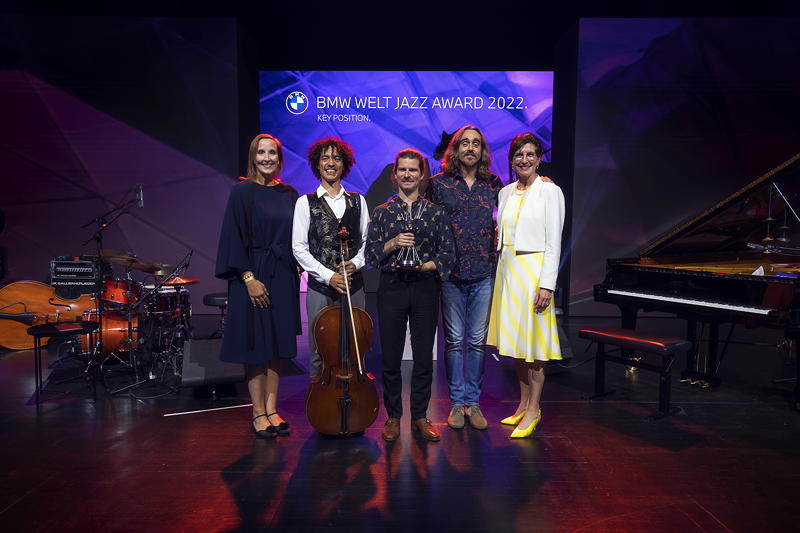 Finale des BMW Welt Jazz Award 2022, v.l.n.r.: Tatjana Bister (Leiterin BMW Welt), Martin Melendez (Cello), Marco Mezquida (Klavier), Aleix Tobias (Schlagzeug), Ilka Horstmeier (Mitglied des Vorstands der BMW AG, Personal und Immobilien, Arbeitsdirektorin