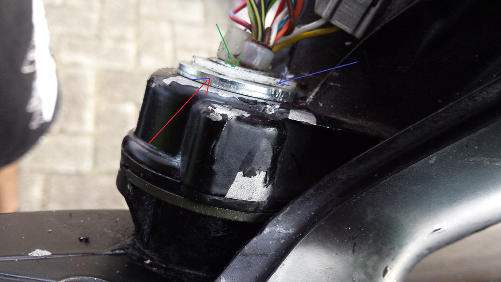 Wenn man fertig ist, stellt sich das Ganze so dar (Hab die Unterlegscheiben unter den Plastikring geschoben, damit der Ring noch "schmiert" (wahrscheinlich Teflon): Die Unterlegscheibe ist rot markiert. Die Teflonscheibe blau und die Führungshülse ist grün markiert.