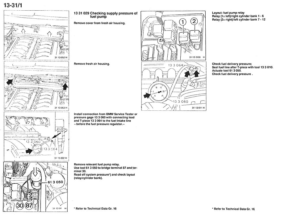 Benzindruck siehe hier Sektion 13-3/-1 , T-Stueck in die Leitung einsetzen https://e31repair.s3-us-west-2.amazo...epair/0187.jpg nimm da immer die Daten von E31 M70, sind ja gleich https://e31repair.com/index.html