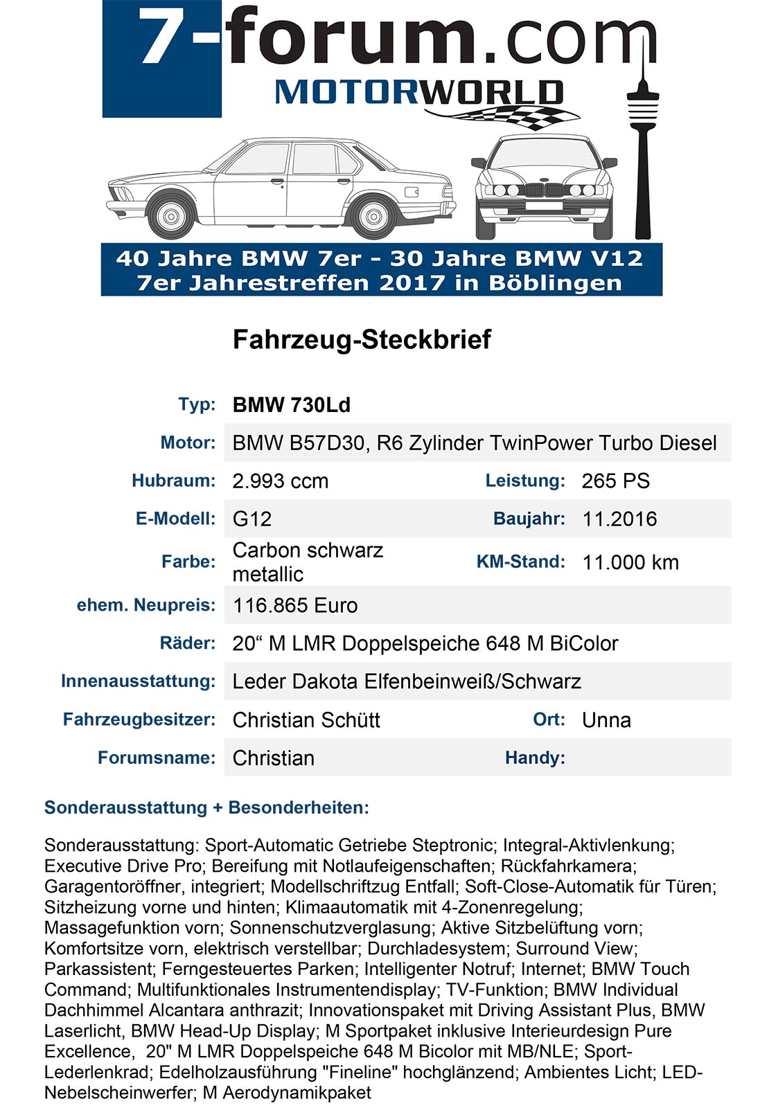 Da wir uns in diesem Jahr in der Motorworld treffen, möchten wir uns auch ggü. Gästen gut präsentieren. Dazu gehört auch eine vernünftige Vorstellung der Teilnehmerfahrzeuge, die wir in Form eines "Fahrzeug Steckbriefes" gewährleisten möchten. Damit haben alle Treffen-Teilnehmer, aber auch alle Gäste der MotorWorld die Möglichkeit, die von uns geparkten 7er-BMWs besser kennen zu lernen. Auch ist es so einfacher möglich, in Kontakt mit einem 7er-Besitzer zu treten, wenn am Fahrzeug der Forumsname und die Telefon-Nr. hinterlegt sind.