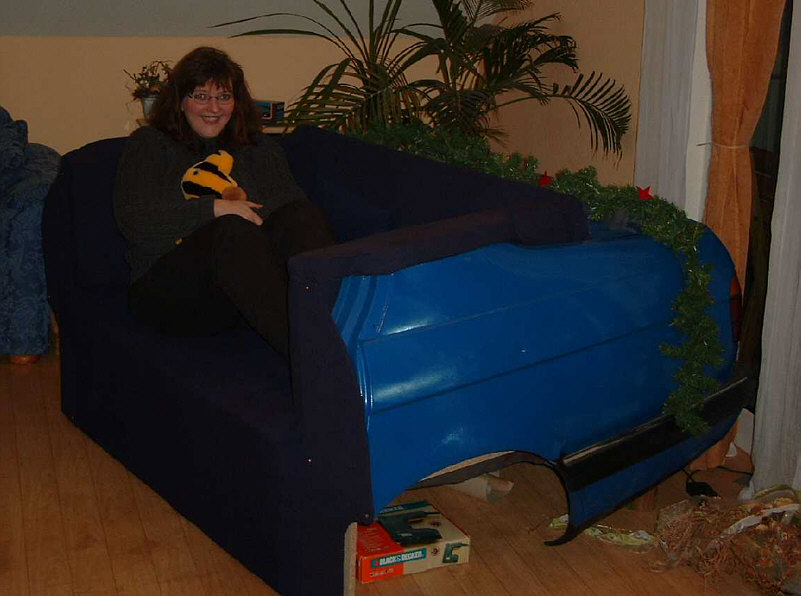 Geschichte: Habe Anfang des Jahres 2002 beim örtlichen Schrotti einen vorne ausgebrannten 93er 750i gefunden. Fahrzeug wurde geschlachtet und brauchbare Teile verhökert; dann die optimale Resteverwertung mittels Flex und Lackspray. Sitzkasten aus Holz gefertigt, Schaumstoff schneiden lassen und mit dickem Stoff bezogen - fertig ist das ultimative Sofa für den 7er-Fan.